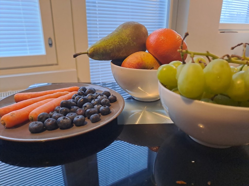 Välillä hedelmät ja marjat korvaavat aamupalaleivänkin, joka ei aina maistu. Leivästä on lähtenyt hieman maku, koska ei enää keksi mitä leivän päälle voi laittaa, kun esimerkiksi leikkeleitä tulisi käyttää mahdollisimman vähän.