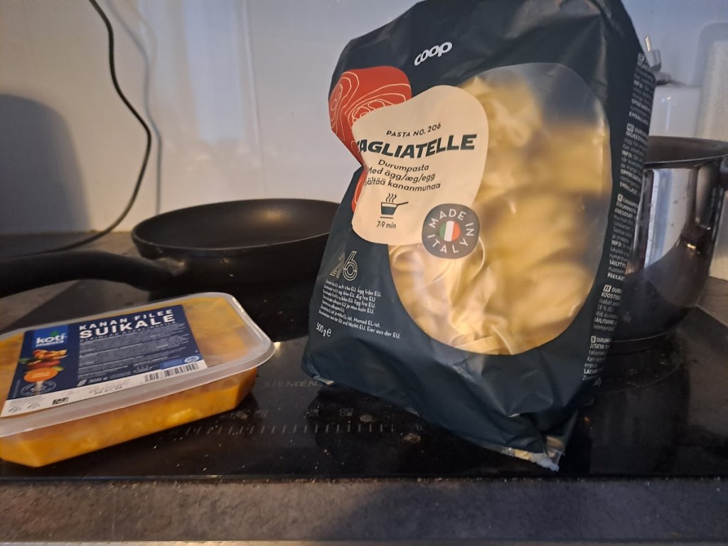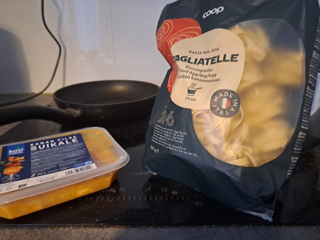 Kävin kaupassa valitsemassa kanan fileesuikaleita ja ostamassa pastaa. Otin myös sipulia, currya, suolaa ja mustapippuria. Valitsin tavallista ruokakermaa, en ole niin juuston ystävä.