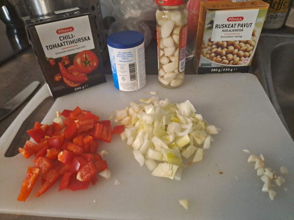 Päätin noudattaa helppoa valmistusohjetta, jossa ei ollut paljon erilaisia vaiheita. Valmiin murskan lisäksi tarvittiin vain sipulia, valkosipulia, paprikaa, vettä ja suolaa. Alku näytti helpolta ja valmistusvaiheet selkeältä.