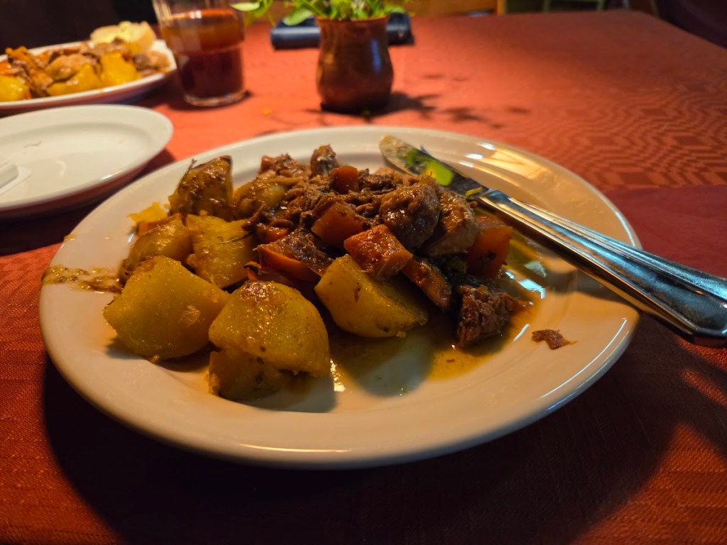 Pääruokana oli todella maukas karjalanpaisti, jota tuli otettua riittävästi.